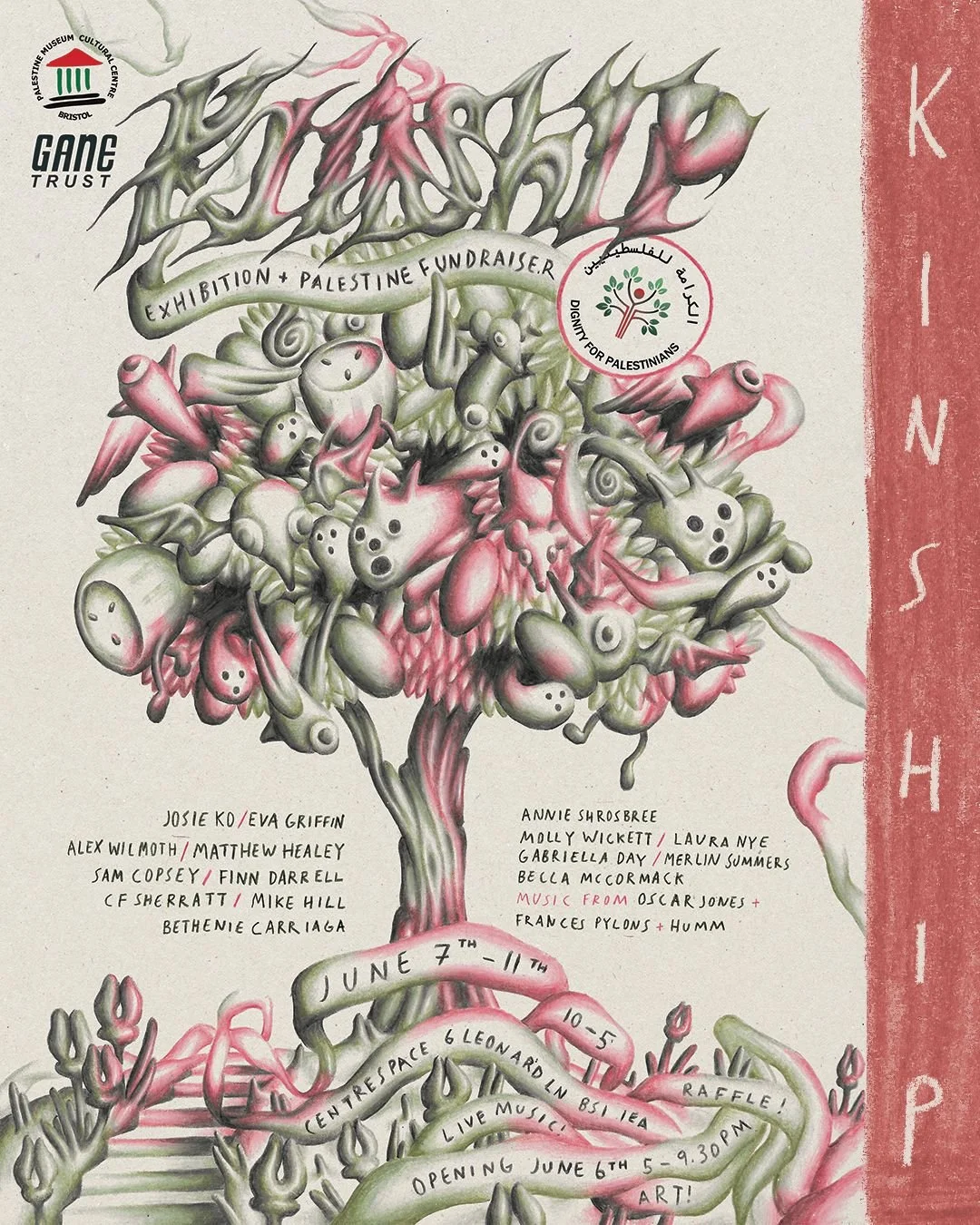Join us for a group exhibition in Centrespace from June 7th-11th, bringing together 15 artists with a connection to Bristol to respond to the theme of kinship and raise money for Dignity for Palestinians - a Gazan charity providing desperately needed food, water and medical aid during the ongoing genocide. Music from Oscar Jones, Frances Pylons and Humm will open the show on June 6th alongside a live art performance from Finn Darrell, an art raffle, and a donations bar, so come and show some love!